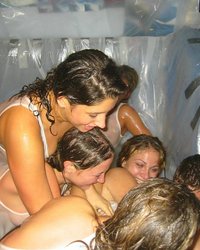 Подружки не знали как развлечься в этот прекрасный вечер, в связи с этим устроили мокрую вечеринку. Основные требования к участницам - это белые майки и никаких лифчиков. Девки начали плескаться в искусственном бассейне и бороться между собой. Некоторые из них быстро избавились от маек и обнажили свои сиськи.