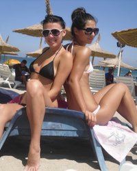 Две подруги разделись под зонтом на пляже - порно фото