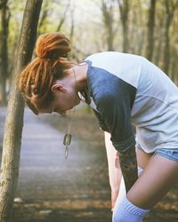Игривая девица с рыжими волосами и татуировками на руках показала грудь - порно фото